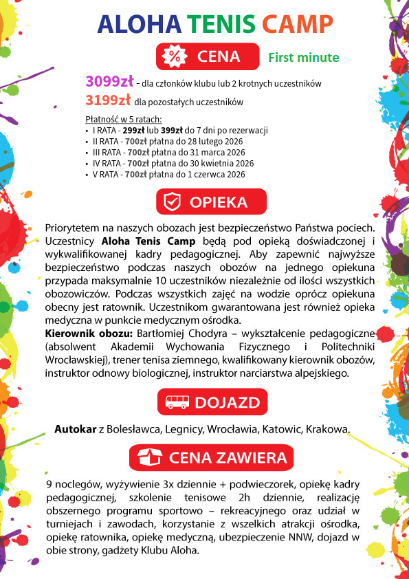 ALOHA TENIS CAMP 2026- OBÓZ LETNI - szczegółowa oferta